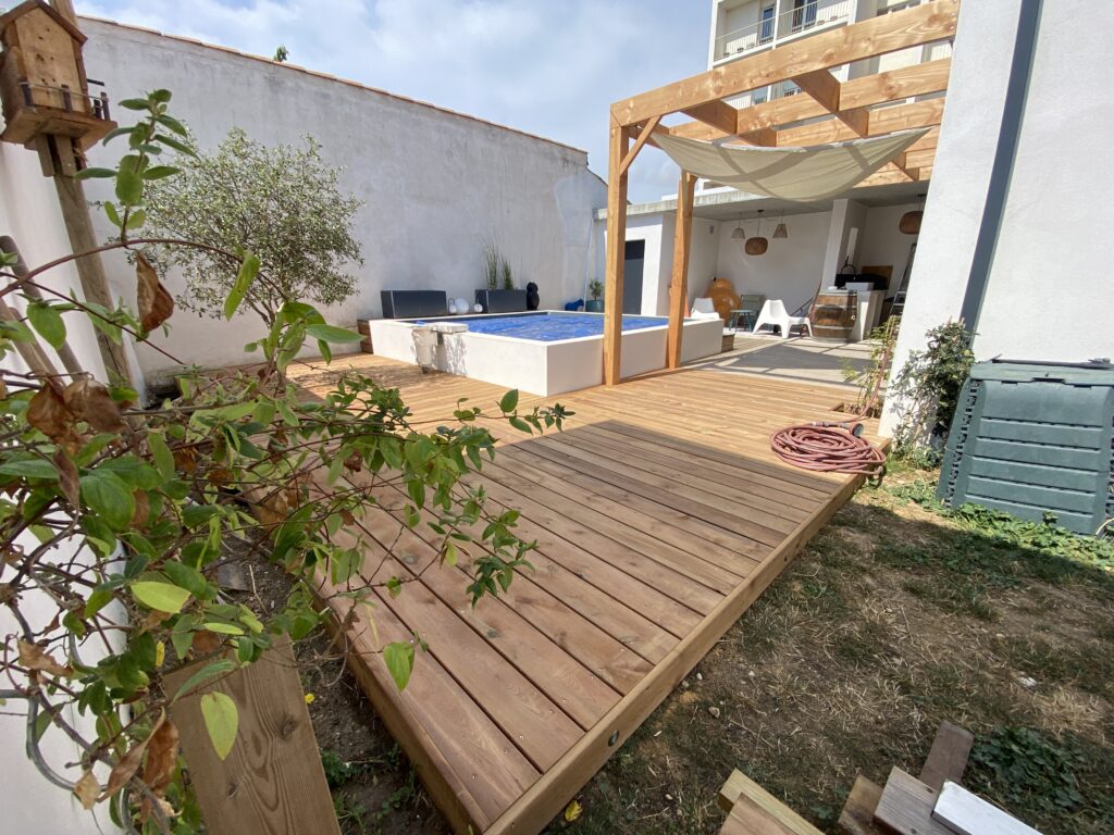 - Platelage autour de piscine : margelles en bois naturel ou composite pour un rendu esthétique et sécurisé.